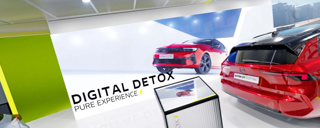 Η χρήση των οθονών ως διαχωριστικών τοίχων υπογραμμίζει επίσης την έννοια του “Detox” στα δύο περίπτερα της Opel. Δεν υπάρχουν περιττά υλικά, αντίθετα η μινιμαλιστική και “διαφανής” παρουσία της Opel τοποθετεί στο επίκεντρο τα 3 ηλεκτροκίνητα μοντέλα που παρουσιάζονται για πρώτη φορά στο κοινό.